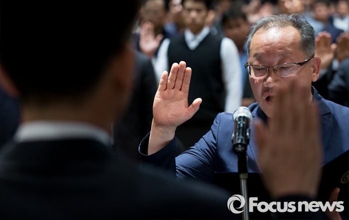 (서울=포커스뉴스) 20일 오후 서울 송파구 교통회관에서 택시노사 4개 단체 및 택시업계 종사자들이 교통안전 향상 결의문 선서를 하고 있다.