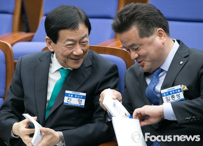 (서울=포커스뉴스) 20일 오전 서울 여의도 국회에서 열린 더불어민주당 20대 총선 당선자 대회에 참석한 진영(왼쪽), 임종성 당선인이 대화하고 있다.