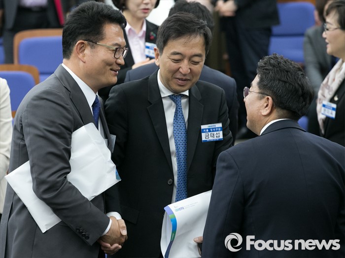 (서울=포커스뉴스) 20일 오전 서울 여의도 국회에서 열린 더불어민주당 20대 총선 당선자 대회에 참석한 송영길(왼쪽부터), 금태섭, 이철희 당선인이 대화하고 있다.