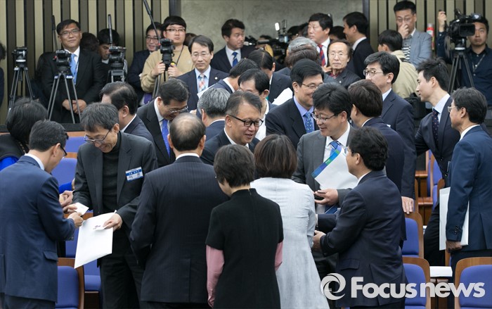 (서울=포커스뉴스) 20일 오전 서울 여의도 국회에서 열린 더불어민주당 20대 총선 당선자 대회에 참석한 당선인들이 서로 인사하고 있다.