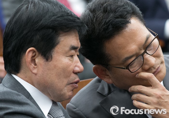 (서울=포커스뉴스) 20일 오전 서울 여의도 국회에서 열린 더불어민주당 20대 총선 당선자 대회에 참석한 김진표(왼쪽), 송영길 당선인이 대화하고 있다.