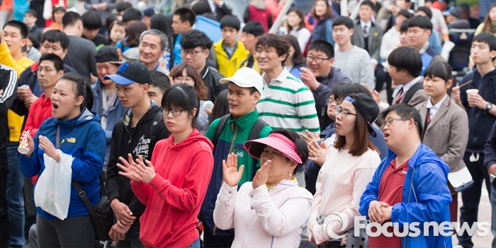 (청주=포커스뉴스) 20일 오후 충북 청주 올림픽국민생활관 일원에서 열린 제36회 장애인의 날 기념행사에서 참가자들이 공연을 보며 즐거운 시간을 보내고 있다.