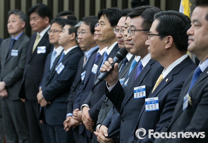(서울=포커스뉴스) 20일 오전 서울 여의도 국회에서 열린 더불어민주당 20대 총선 당선자 대회에 참석한 윤호중 등 경기도 지역 당선인들이 인사말을 하고 있다.