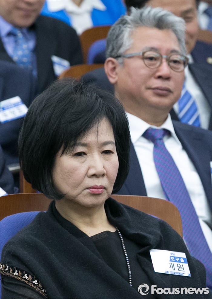 | △ 인사말 듣는 손혜원-조응천 |