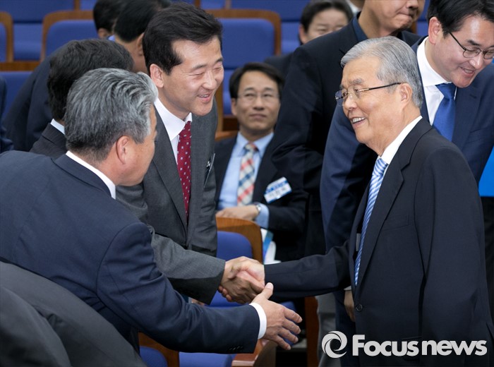 (서울=포커스뉴스) 20일 오전 서울 여의도 국회에서 열린 더불어민주당 20대 총선 당선자 대회에 참석한 김종인(오른쪽) 비대위 대표가 당선인들과 인사하고 있다.