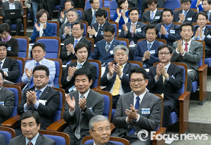 (서울=포커스뉴스) 20일 오전 서울 여의도 국회에서 열린 더불어민주당 20대 총선 당선자 대회에 참석한 당선인들이 박수치고 있다.