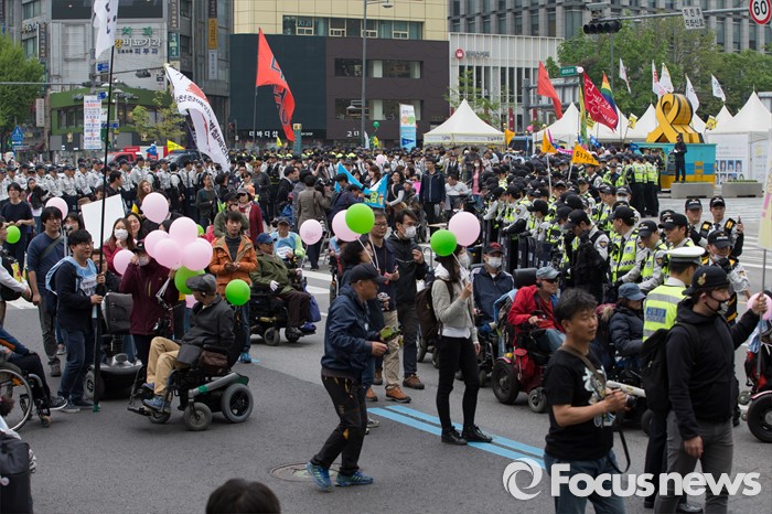 (서울=포커스뉴스) 20일 오후 서울 광화문 광장에서 420장애인차별철폐연대 공동투쟁단 단원들이 '420장애인차별철폐 투쟁결의대회'를 마치고 행진을 하고 있다.