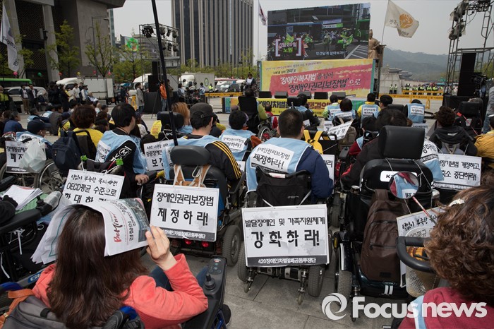 (서울=포커스뉴스) 20일 오후 서울 광화문 광장에서 420장애인차별철폐연대 공동투쟁단 단원들이 '420장애인차별철폐 투쟁결의대회'를 하고 있다.