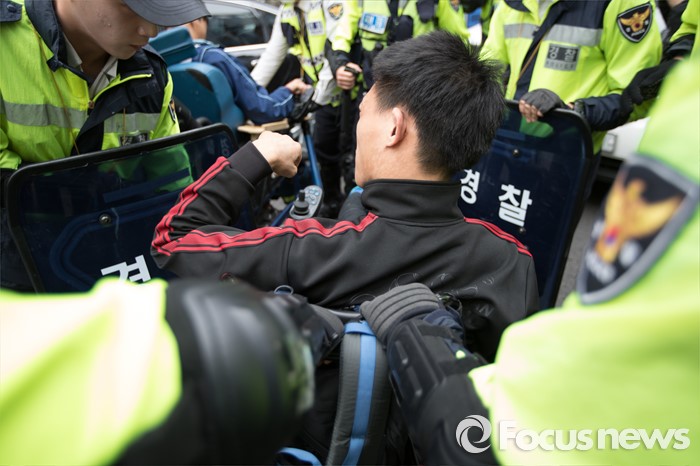 (서울=포커스뉴스) 20일 오후 서울 광화문 광장에서 '420장애인차별철폐 투쟁결의대회'를 마친 일부 참가자들이 행진을 하던중 예정된 진로를 벗어나자 경찰과 대치를 하고 있다.