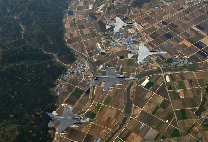 (서울=포커스뉴스) 지난 15일부터 오는 29일까지 전북 군산 비행장에서 실시되고 있는 한·미 공군 대규모 항공전역훈련인 맥스썬더 훈련에서 7공군사령관 테런스 오셔너시 중장은 우리 공군의 FA-50 전투기(위에서 두번째)를, 작전사령관 이왕근 중장은 미공군의 F-16전투기(위에서 세번째)를 탑승해 공중에서 작전을 지휘하고 있다. <사진제공=공군>