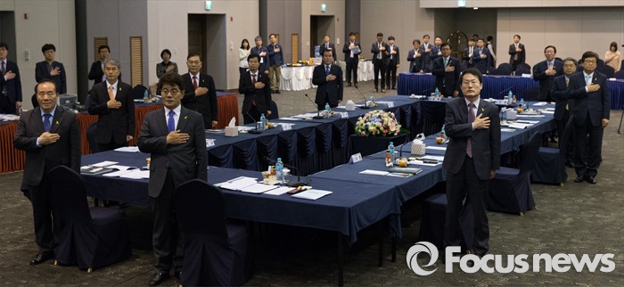 (인천=포커스뉴스) 장휘국 광주시교육감을 비롯한 전국 교육감들이 20일 오후 인천 중구 하버파크호텔에서 열린 전국 시도교육감협의회 간담회에 참석해 국민의례 하고 있다.