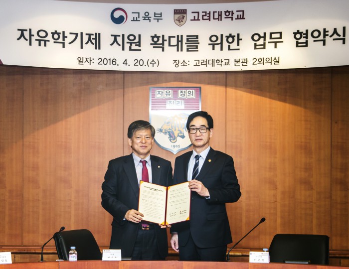 (서울=포커스뉴스)고려대학교가 20일 오전 서울 성북구 고려대학교 본관에서 교육부와 '자유학기제 지원 확대를 위한 업무협약'을 체결했다.