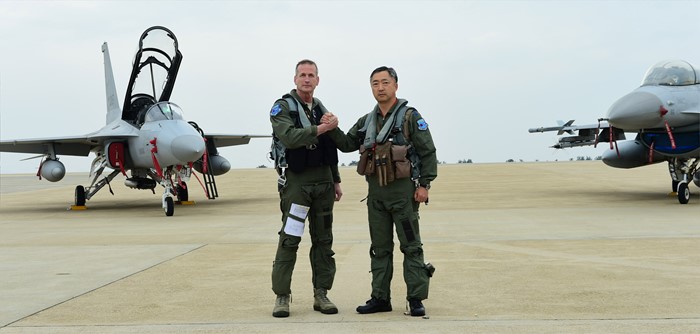 (서울=포커스뉴스) 지난 15일부터 오는 29일까지 전북 군산 비행장에서 실시되고 있는 한·미 공군 대규모 항공전역훈련인 맥스썬더 훈련에서 지휘비행을 마치고 작전사령관 이왕근 중장과 7공군사령관 테런스 오셔너시 중장이 기념촬영을 하고 있다. <사진제공=공군>