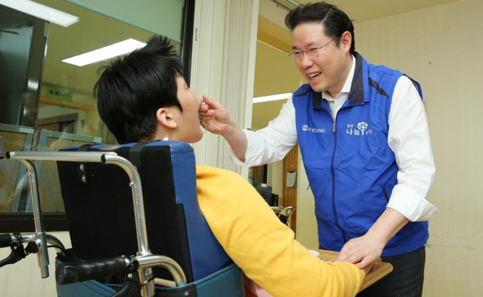 '가족봉사단'도 운영해 매주 둘째 주 토요일 임직원과 가족이 함께 나눔을 실천하고 있다.장애인의 날을 맞아 '영락애니아의 집'에서 실시한 '함께하는 체육대회'에서 조현상 효성나눔봉사단장이 장애아동의 식사를 도와주고 있다.<사진제공=효성>