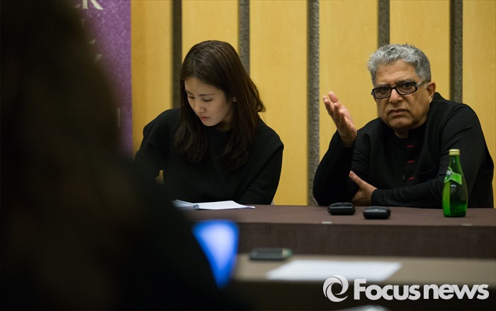 (서울=포커스뉴스) 토크쇼 여왕 오프라 윈프리와 팝가수 레이디가가, 마돈나의 정신적 지주이며 스승으로 알려진 하버드대 의학박사 디팍 초프라(Deepak Cfopra)가 20일 오후 서울 광진구 워커힐 호텔에서 열린 '2016 슈퍼 소울 릴레이' 힐링 콘서트 강연에 앞서 취재진 질문에 답변하고 있다.
