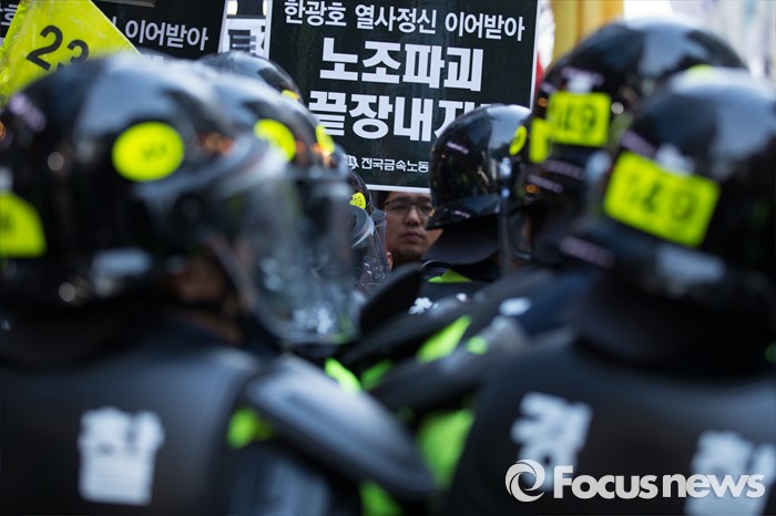 한편 유성범대위는 지난 18일 부터 오는 23일까지를 회사의 노조 탄압에 못이겨 스스로 목숨을 끊은 (故)한광호 유성기업 노동조합원의 죽음을 애도하는 집중추모기간으로 정했다.(서울=포커스뉴스) 26일 오후 서울 중구 무교동에서 '2016 총선투쟁 승리 범국민대회' 행진을 끝내고 유성기업 지회조합원들이 거리시위를 하고 있다. 유성기업 공대위는 故 한광호 조합원 죽음의 원인이 된 노조파괴를 중단하고 유성기업과 현대기아차의 처벌을 요구하고 있다. 2016.03.26 허란 기자