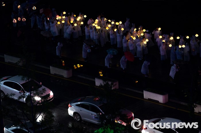 (서울=포커스뉴스) 20일 오후 서울 종로구 광화문 광장에서 부처님오신날(5월 14일)을 앞두고 봉축행사의 일환인 '사사자 삼층석탑등 점등식'이 열리고 있다.