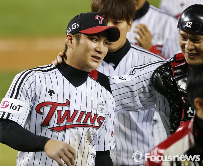 (서울=포커스뉴스) 20일 서울 잠실구장에서 열린 2016 프로야구 NC-LG 경기에서 NC를 6-3으로 물리친 후 LG 정상호(오른쪽)가 오지환을 끌어 안고 있다.