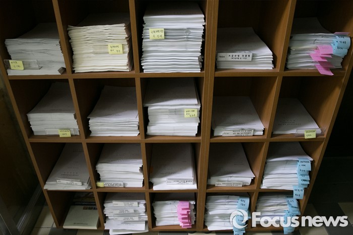 (서울=포커스뉴스) 제19대 국회 마지막 임시국회 개원일인 21일 오전 서울 여의도 국회 본관의 한 상임위원회 앞에 법안 서류들이 쌓여 있다.