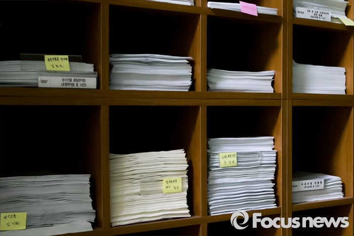 (서울=포커스뉴스) 제19대 국회 마지막 임시국회 개원일인 21일 오전 서울 여의도 국회 본관의 한 상임위원회 앞에 법안 서류들이 쌓여 있다.