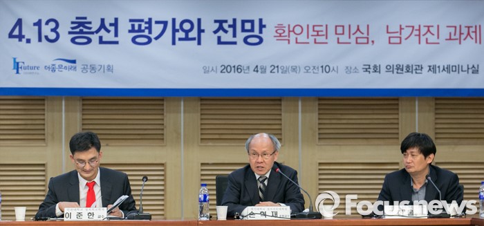 (서울=포커스뉴스) 21일 오전 서울 여의도 국회 의원회관에서 더미래연구소와 더좋은미래 모임 공동주최로 열린 4·13 총선 평가와 전망 확인된 민심, 남겨진 과제 토론회에 참석한 손혁재 경기대학교 정치전문대학원 초빙교수가 발언하고 있다. 왼쪽부터 이준한 인천대학교 정치외교학과 교수, 손 교수, 정한울 고려대학교 평화와 민주주의연구소 연구교수.