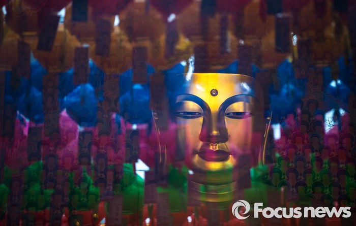 (서울=포커스뉴스) 21일 오전 서울 종로구 조계사에서 열린 관불의식-금박공양 행사장에 부처의 얼굴이 유리창을 통해 비치고 있다. 관불은 불교의식으로 탄생불의 형상에 물을 부어 씻겨 자신의 마음에 쌓인 죄와 번뇌를 맑고 깨끗하게 만들어 복을 누리게 된다고 알려진 의식이다.