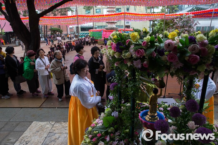 (서울=포커스뉴스) 21일 오전 서울 종로구 조계사에서 관불의식이 열리고 있다. 관불은 불교의식으로 탄생불의 형상에 물을 부어 씻겨 자신의 마음에 쌓인 죄와 번뇌를 맑고 깨끗하게 만들어 복을 누리게 된다고 알려진 의식이다.