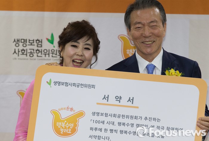 ‘100세 시대, 행복수명 캠페인’은 대한민국의 노후준비 실천문화 확산을 위한 공익 캠페인이다. 홍보대사로 위촉된 이애란은 국민들의 노후준비 필요성에 대한 관심을 높이고 실천을 이끌어내는 활동을 펼칠 예정이다.(서울=포커스뉴스) 21일 오전 서울 종로구 센터포인트빌딩에서 열린 '생명보험사회공헌위원회 '100세 시대 행복수명 캠페인' 홍보대사 위촉식에 참석한 가수 이애란(왼쪽)과 이수창 공동위원장이 기념사진을 찍고 있다. 2016.04.21 김유근 기자 (서울=포커스뉴스) 21일 오전 서울 종로구 센터포인트빌딩에서 열린 '생명보험사회공헌위원회 '100세 시대 행복수명 캠페인' 홍보대사 위촉식에 참석한 가수 이애란이 인사말을 하고 있다. 2016.04.21 김유근 기자