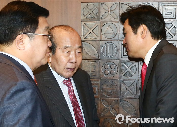 (서울=포커스뉴스) 원유철(오른쪽) 새누리당 원내대표와 김수한(가운데) 전 국회의장, 권철현 전 주일대사가 21일 오후 서울 여의도 LG트윈타워의 한 중식당에서 상임고문단 오찬회에 참석해 대화하고 있다.