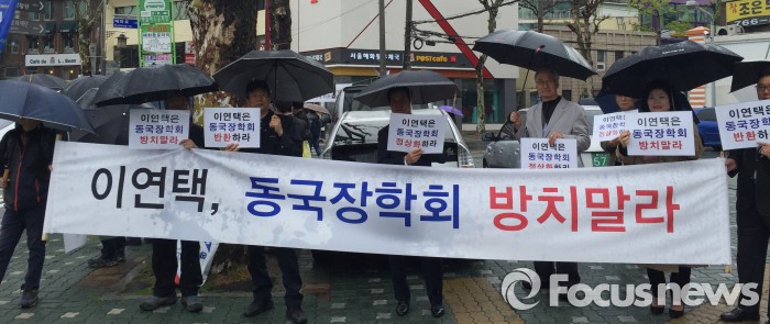 해당 교육청인 서울시교육청 관계자는 "현재 정관상 장학회 당연직 이사장인 동창회장과 동국장학회 이사에 관해 무효확인소송이 각각 진행 중이라 소송이 끝나면 이사회 정상화를 위한 추가 조치를 취할 예정"이라고 밝혔다.21일 오전 10시 동국대학교 총동창회 소속 동문 20여명은 서울 종로구 혜화동 혜화파출소 앞에서 이연택 동국장학회 이사의 퇴진을 요구하는 집회를 열었다. 김대석 기자
