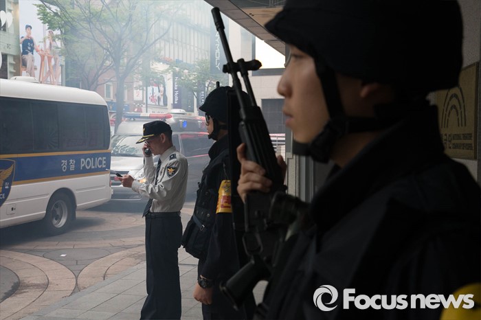 (서울=포커스뉴스) 21일 오후 서울 중구 명동예술극장에서 경찰특공대, 중부소방서, 218연대 등이 공연장 대테러훈련을 실시하고 있다.