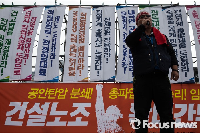 (서울=포커스뉴스) 21일 오후 서울역 앞에서 민주노총 전국건설노동조합 전국의 간부들이 건설노조 확대간부 결의대회를 열고 건설민생법안 통과를 촉구하는 집회를 하고 있다.