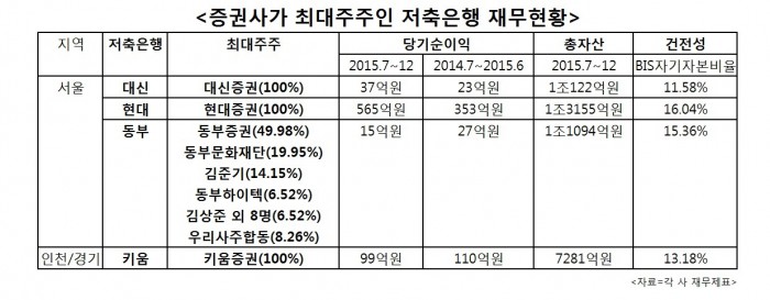 키움증권이 100%지분을 갖고 있는 키움저축은행의 작년 회계연도 당기순익은 99억원이었으며 대신증권이 최대주주(지분율 100%)인 대신저축은행의 같은 기간 당기순이익은 37억원으로 집계됐다.