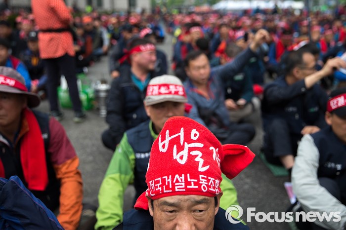 (서울=포커스뉴스) 21일 오후 서울역 앞에서 민주노총 전국건설노동조합 전국의 간부들이 건설노조 확대간부 결의대회를 열고 건설민생법안 통과를 촉구하는 집회를 하고 있다.