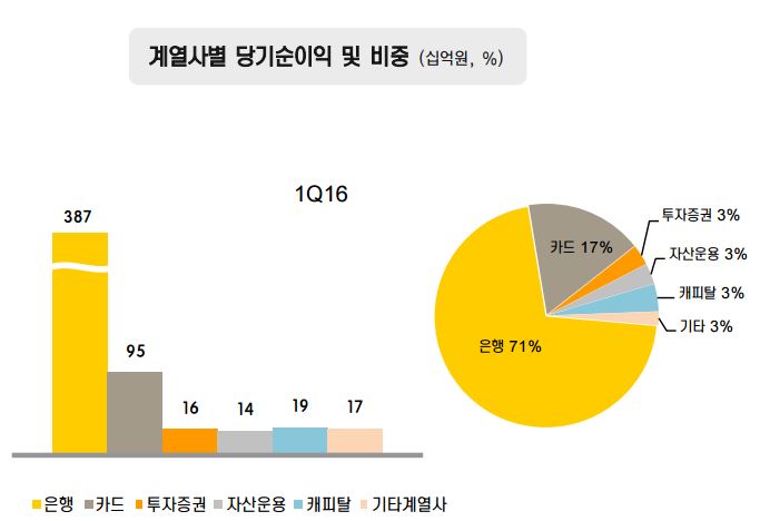 1분기 그룹 신용손실충당금 전입액은 일부 해운 및 조선업종 부실 우려로 1190억원을 기록했다. 순이자이익은 1조5063억원으로 전년 동기 대비 2.0%(306억원) 감소했고, 순수수료이익은 전년 동기 대비 3.6%(139억원) 감소한 3682억원이다.