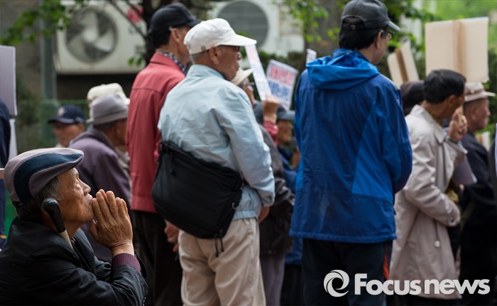 (서울=포커스뉴스) 최근 전경련의 차명계좌 자금 지원 의혹을 받고 있는 어버이연합 회원들이 21일 오후 서울 용산구 시사저널 사옥 앞에서 시사저널 규탄 기자회견을 하고 있다.