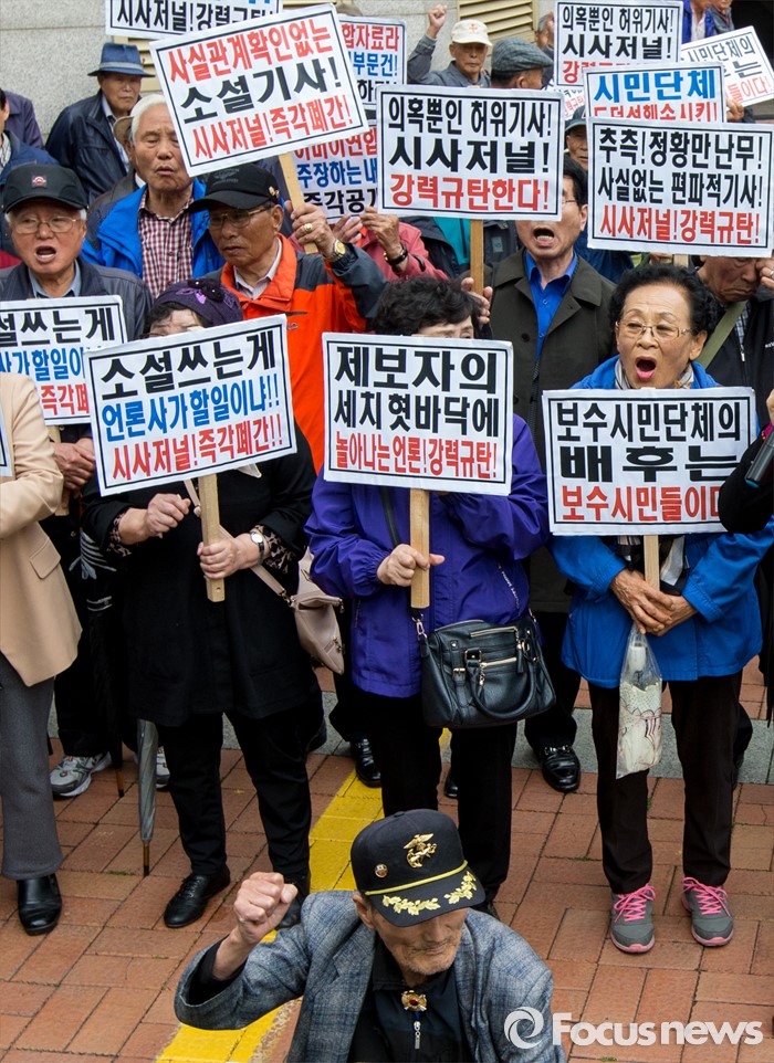 (서울=포커스뉴스) 최근 전경련의 차명계좌 자금 지원 의혹을 받고 있는 어버이연합 회원들이 21일 오후 서울 용산구 시사저널 사옥 앞에서 시사저널 규탄 기자회견을 하고 있다.