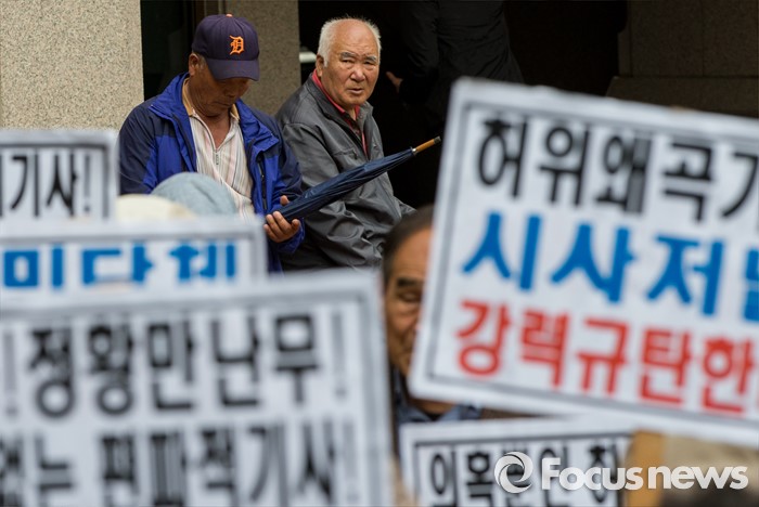 (서울=포커스뉴스) 최근 전경련의 차명계좌 자금 지원 의혹을 받고 있는 어버이연합 회원들이 21일 오후 서울 용산구 시사저널 사옥 앞에서 시사저널 규탄 기자회견을 하고 있다.