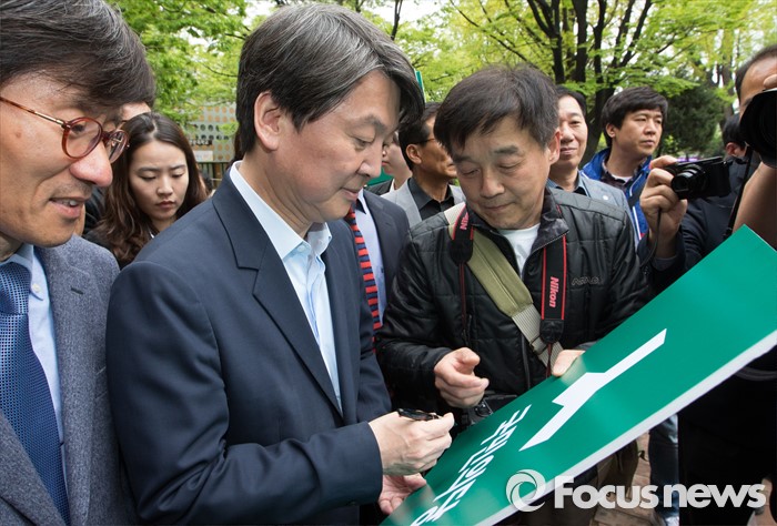(청주=포커스뉴스) 안철수 국민의당 상임공동대표가 21일 오후 충북 청주 상당구 중앙공원을 찾아 지지자에게 싸인을 하고 있다. 안 대표는 4.13 국회의원선거에서 국민의당을 지지해준 것에 대한 감사의 뜻을 전했다.