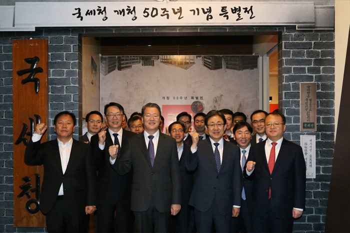 (세종=포커스뉴스) 임환수 국세청장을 비롯한 국세청 직원들이 21일 정부세종2청사 국세청 내 조세박물관에서 열린 국세청 개청 50주년 특별전 개관식을 마친 뒤 파이팅을 하고 있다. <사진제공=국세청>