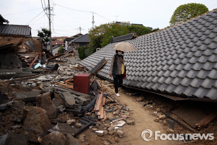 일본 기상청은 토사 재해와 폭풍에 대해 경계령을 내리고 낮은 토지의 침수와 하천의 범람, 번개·태풍 등에 주의를 기울일 것을 당부했다.일본 구마모토현 마시키정에서 지난 20일 한 여성이 지진으로 붕괴된 가옥 옆을 지나가고 있다. (Photo by Carl Court/Getty Images) 2016.04.21 ⓒ게티이미지/이매진스