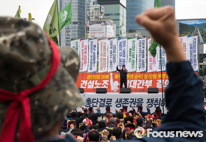 (서울=포커스뉴스) 전국건설노동조합이 21일 오후 2시 서울 중구 서울역 광장에서 전국 10개 지역본부와 40개 지부가 참석하는 대규모 결의대회를 열었다.