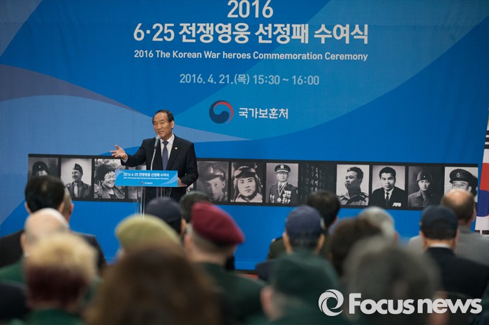(서울=포커스뉴스) 21일 오후 서울 용산구 전쟁기념관에서 열린 6.25 전쟁영웅 선정패 수여식에서 박승춘 국가보훈처장이 인사말을 하고 있다.