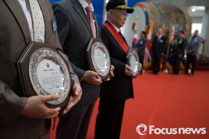 (서울=포커스뉴스) 21일 오후 서울 용산구 전쟁기념관에서 열린 6.25 전쟁영웅 선정패 수여식에서 참전용사들과 가족들이 상패를 받고 있다.