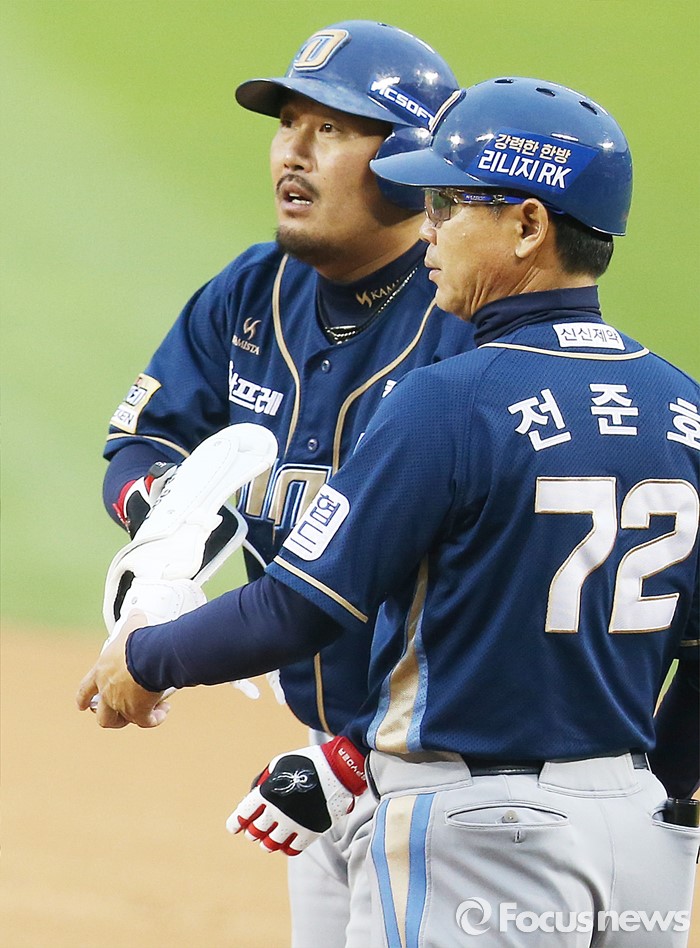 (서울=포커스뉴스) 21일 서울 잠실구장에서 열린 2016 프로야구 NC-LG 경기 2회초 무사 1,2루에서 NC 이호준이 선제 1타점 우중간안타를 치고 1루에서 덕아웃을 보고 있다.