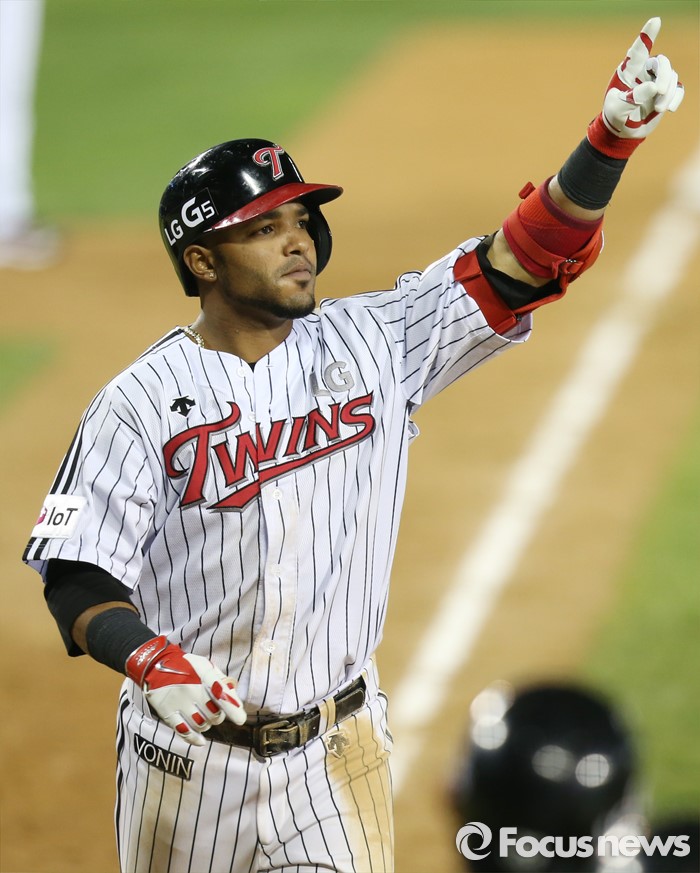 (서울=포커스뉴스) 21일 서울 잠실구장에서 열린 2016 프로야구 NC-LG 경기 5회말 2사 1,2루에서 LG 히메네스가 좌월 3점 연타석 홈런을 치고 1루 관중석을 향해 손을 뻗으며 홈인하고 있다.