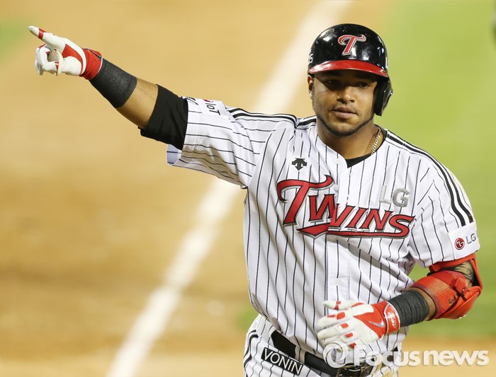 (서울=포커스뉴스) 21일 서울 잠실구장에서 열린 2016 프로야구 NC-LG 경기 4회말 LG 히메네스가 서상우의 홈런에 이어 좌월 1점홈런을 치고 중앙 관중석을 가리키며 홈인하고 있다.
