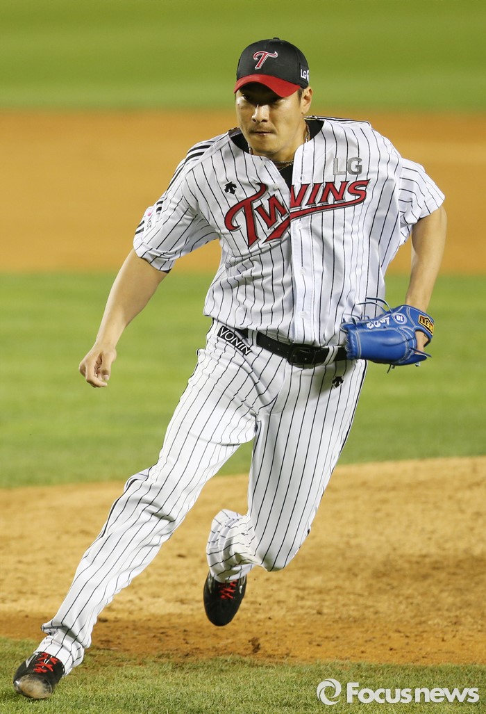 (서울=포커스뉴스) 21일 서울 잠실구장에서 열린 2016 프로야구 NC-LG 경기 8회초 1사 1루에서 LG 투수 이동현이 NC 김준완의 번트 타구를 잡으려 뛰고 있다.