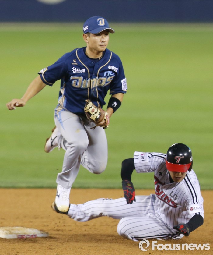 (서울=포커스뉴스) 21일 서울 잠실구장에서 열린 2016 프로야구 NC-LG 경기 8회초 1사 1루에서 LG 오지환의 2루 땅볼때 1루주자 정주현이 2루에서 포스아웃되고 있다. 왼쪽은 NC 유격수 손시헌.