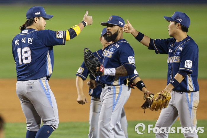 (서울=포커스뉴스) 21일 서울 잠실구장에서 열린 2016 프로야구 NC-LG 경기에서 승리한 NC 박석민과 지석훈이 마운드에서 엄지를 세우고 기뻐하고 았다.